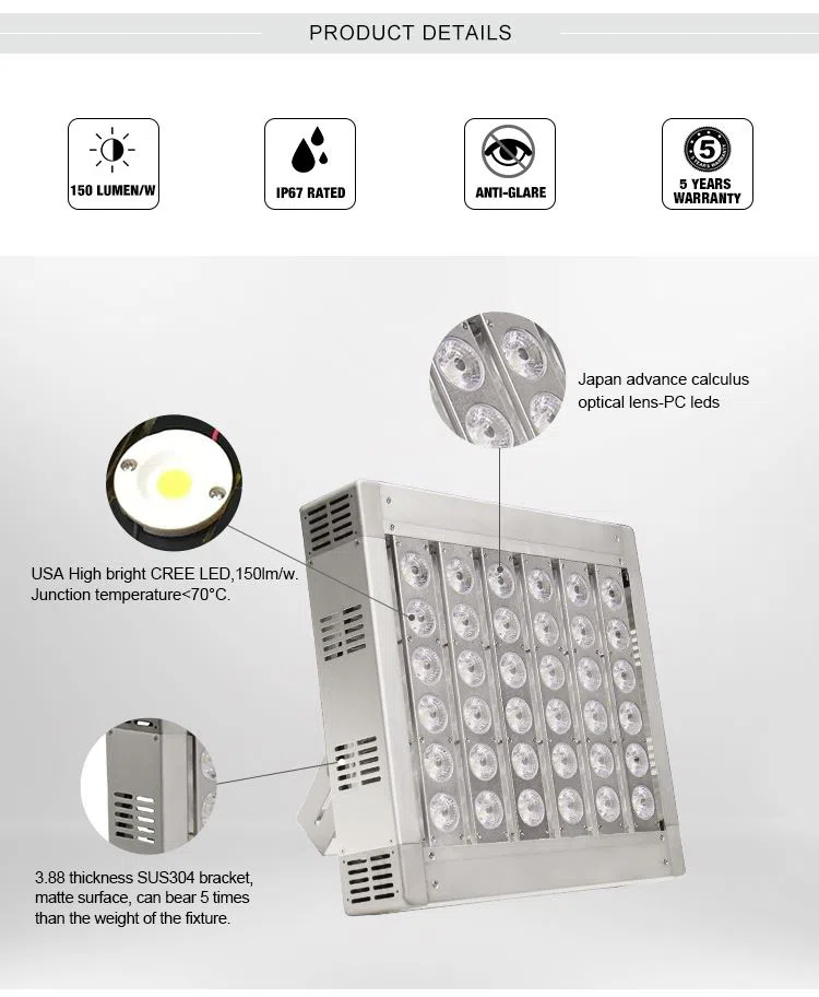 روشنایی میدان نور ورزشگاه فوتبال Benwei یک مدل بسیار کارآمد است که به طور انحصاری برای استادیوم و سایر برنامههای نصب بلند که در آن زاویه پرتو مستقیم یا گسترده مورد نیاز است طراحی شده است. چراغهای میدانی با تراشههای LED با کارایی بالا به معنای قدرت کمتر برای نور بیشتر است. رادیاتورهای با کیفیت بالا تولید گرما را کاهش می دهند تا به نور با طول عمر بیشتر کمک کنند.
