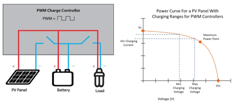 PWM مخفف Pulse-Width Modulation است. زمانی که بانک خمیر پر است، این موضوع به کار میرود. همانطور که شارژ می شود، کنترل کننده شارژ خورشیدی به اندازه ای که پانل PV می تواند تولید کند جریان می دهد تا به ولتاژ مورد نظر برای مرحله شارژ کنترلر برسد. هنگامی که باتری به ولتاژ مورد نظر خود می رسد، کنترل کننده سپس بین بانک های باتری به آرایه پانل سوئیچ می کند. سپس بانک باتری قطع می شود که ولتاژ باتری را تنظیم می کند و آن را ثابت می کند. این روش سوئیچ سریع PWM نامیده میشود و کاری که انجام میدهد این است که اطمینان حاصل میکند که بانک باتری شما شارژ میشود و از فرآیند شارژ بیش از حد جلوگیری میکند.